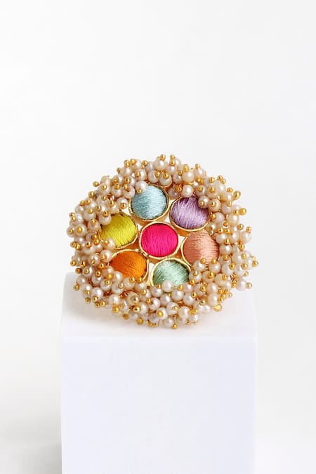The ring is a statement piece with pearl clusters and multicolor silk embroidery.