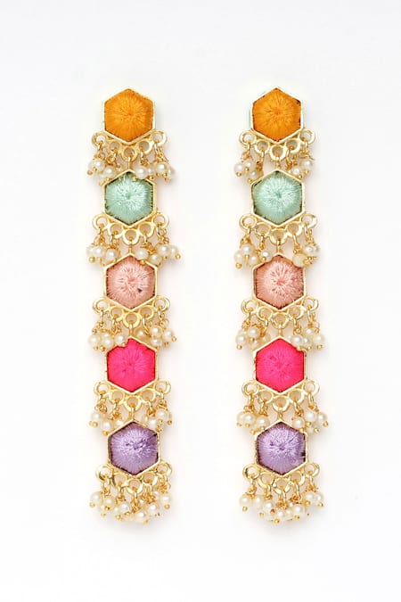 Multicolor dangler earrings featuring five-tier geometrical design embellished with pearls and thread work