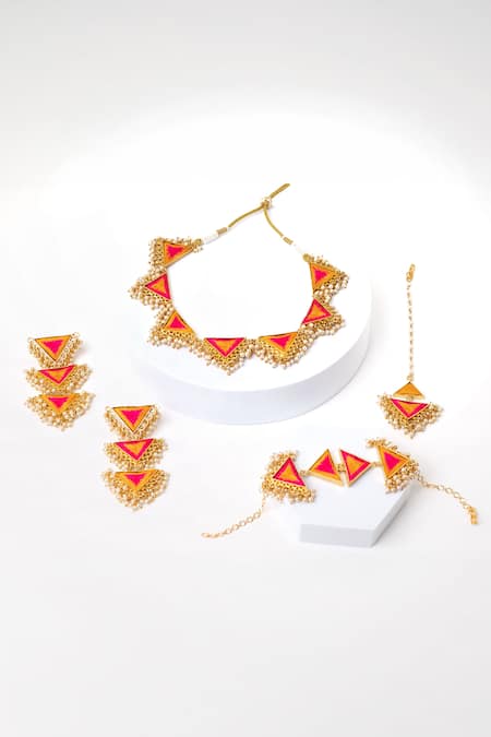 22kt gold plated triangle cutwork, Pearl clusters adorning the pieces, Silk embroidered detailing