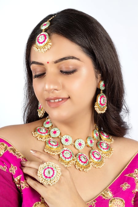 Mint blue-pink thread embroidered center motifs, Pearl tassels surrounding the ring, 22kt gold plating for a luxurious finish
