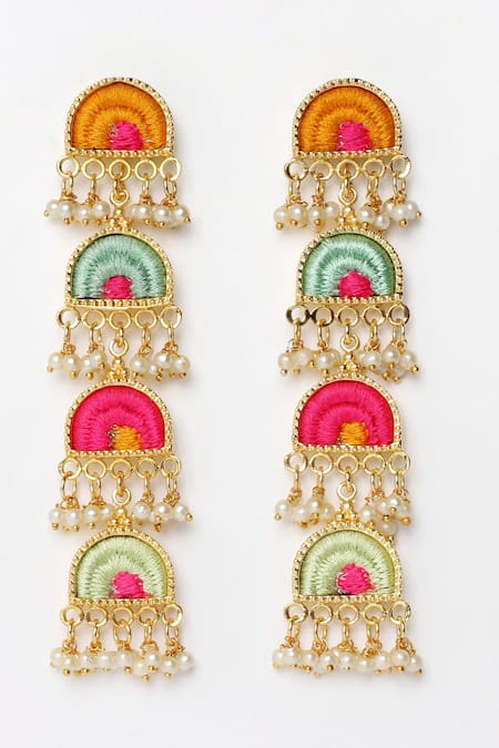Multicolored dangler earrings featuring four tiers with semicircular designs and pearl embellishments