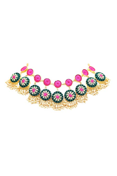 Gold choker featuring two layers with circular motif pendants and cluster pearl drops
