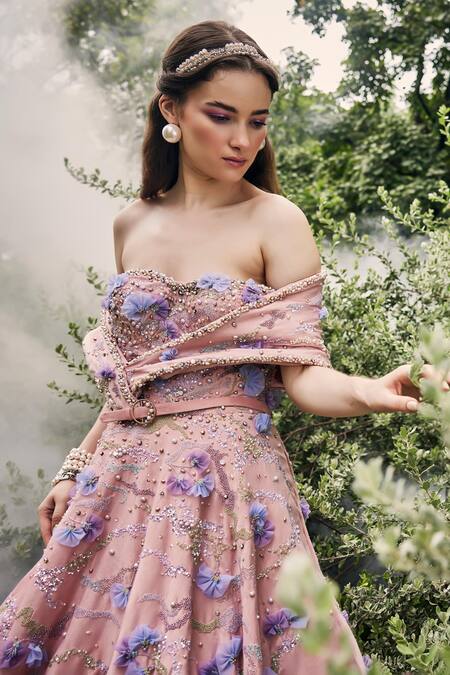 Scattered sequin and pearl embellishments, Net flowers detailing, Draped bodice with a pearl belt