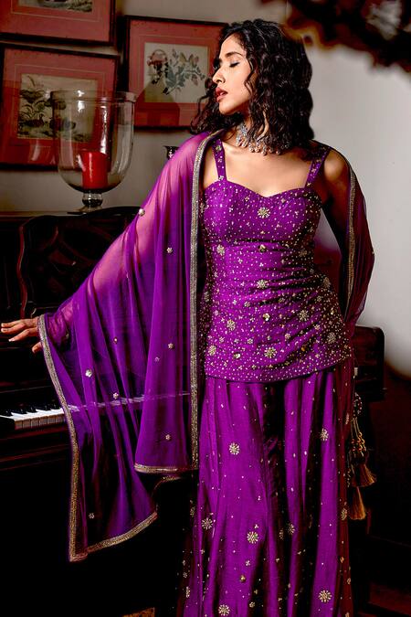 Purple kurta featuring bead, cutdana, and sequin embroidery in floral patterns. Paired with flared pants and a border embroidered sheer dupatta.