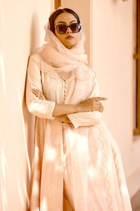 Peach Anarkali featuring sequin and thread embroidery in geometric pattern on the yoke. Paired with a scallop bordered sheer dupatta and straight pant.