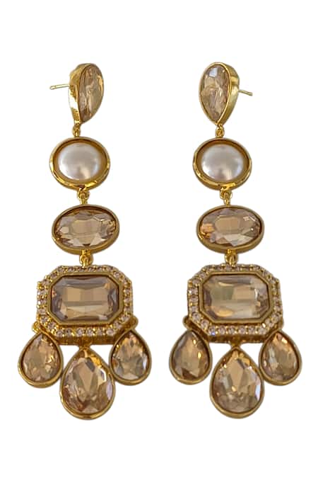 Gold brass dangler earrings featuring crystals, pearls, and zircons with a push-back closure.