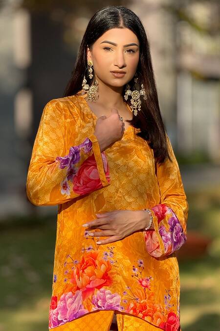 Yellow top featuring a notched collar neck and full sleeves with dewdrop flora print. Paired with bootcut pants in a florin jaal print.
