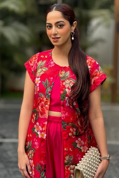 Hot pink jacket featuring a rosa garden print with short sleeves. Paired with a solid bustier and flared pant.