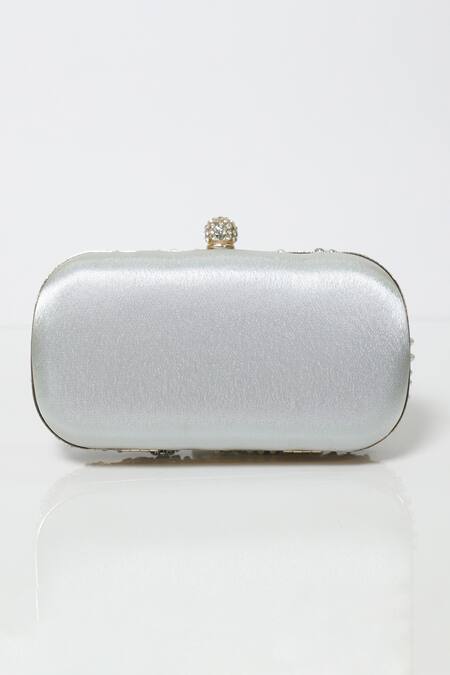 Silver clutch bag featuring pearl embellishment in floral vine pattern. Comes with a detachable sling chain and a metal clasp closure.