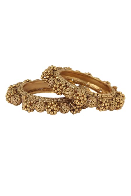 Gold kada bangles featuring carved beads, cutwork detail, and ball motifs. This set includes two intricately designed bangles made from a silver and copper mix.