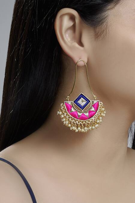 Gold-tone earrings with pearl drops & resham work half-moon motif.