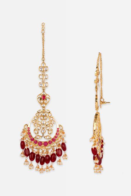 Gold-tone chandbalis with encrusted ruby red stone drops, cluster beads & encrusted pink stones. Comes with kaanchain.