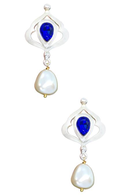 Silver-plated danglers with Mughal motif cutwork top, encrusted persian blue Swarovski crystals in prong - bezel setting & pearl drops.