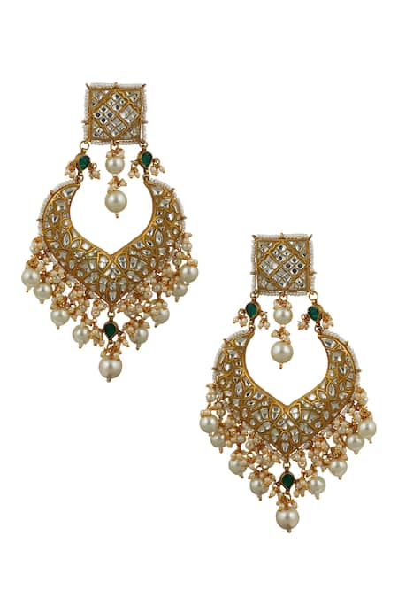 Gold chandbali-style danglers featuring cluster pearls and geometric top