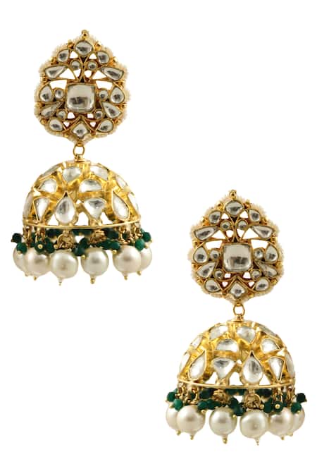 Gold jhumka earrings featuring a floral motif top with a bead embellished rim