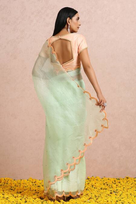 Mint green organza saree with butti pattern bead, sequin hand embroidery & scalloped cut work hem. Paired with peach leaf neck blouse with embroidered border.