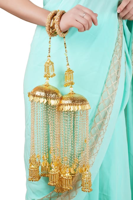 Gold toned kaleeras featuring ghungroos and bead layering detail. Includes a set of 2 with intricate leaf carving and a drawcord closure.