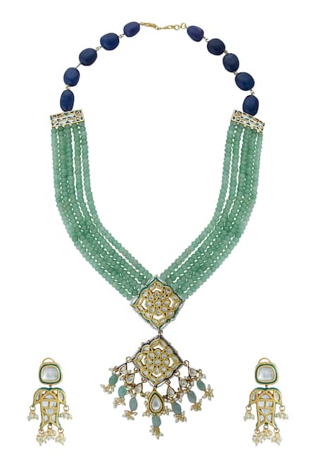 Gold toned necklace with bead strands & Polki style stone embellishments. Comes with earrings.