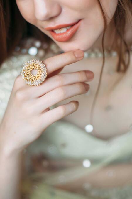 Gold-plated ring with pearl beads & filigree cutout pattern.