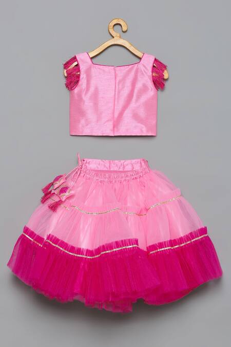 Pink lehenga featuring soft tulle tiers with an embroidered waistband. Paired with a raw silk blouse adorned with hand embroidery in beads and cut dana, complemented by a matching dupatta.