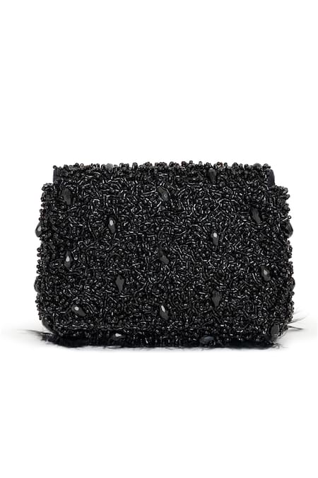 Black velvet clutch adorned with crystal embellishments. Features a detachable handle and a crossbody sling.