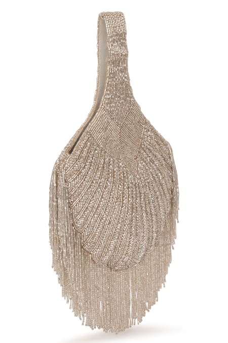 Crystal embellishments on the surface, Fringe detailing at the bottom, Unique shell-like shape