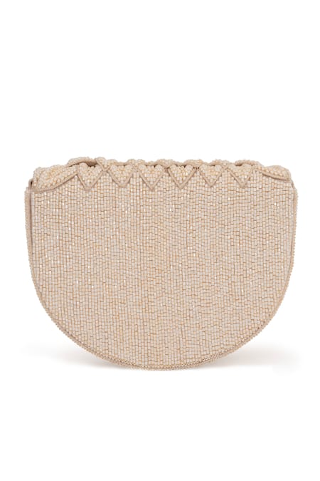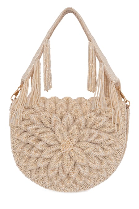 Ivory Crystals, Beads Rose And Work Clutch With Sling Chain