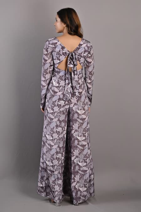 Purple mauve cotton satin jumpsuit with floral print, flared bottom, puff sleeves & back cutwork with tie-up.