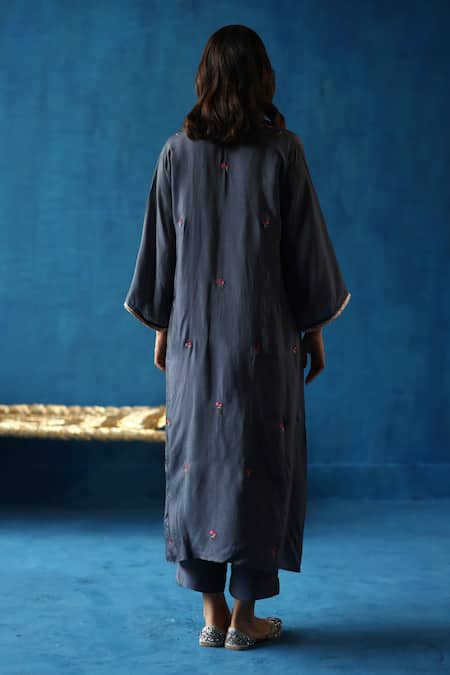 Grey phiran featuring intricate hand-embroidered tilla, gota, resham, and zari work detailing on the yoke. Paired with coordinating silk pant.