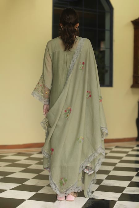 Olive green kurta with thread embroidered yoke in applique flowers. Paired with lace trimmed hem pant. Comes with a chequered floral dupatta & a cotton slip.