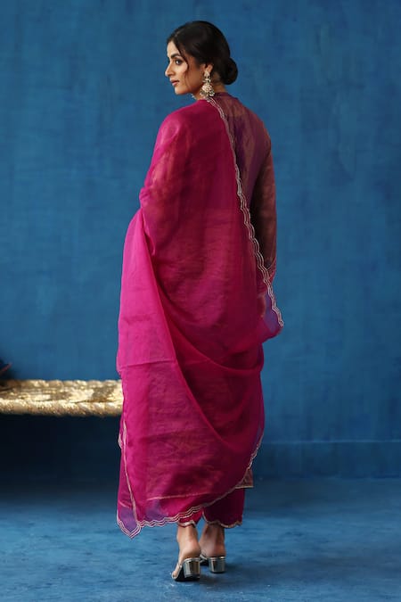 Garnet kurta featuring a V neck with hand-embroidered tilla, zari, resham, danka, and gota work on the yoke and sleeves. Paired with satin pant, slip, and organza dupatta with scalloped edges.