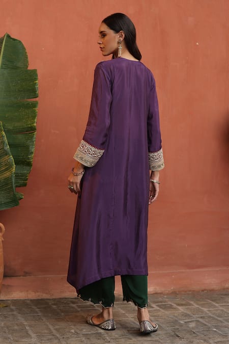 Purple kurta featuring resham and gota patti embellishment in floral veil pattern. Paired with contrast green pants and a red organza stole.