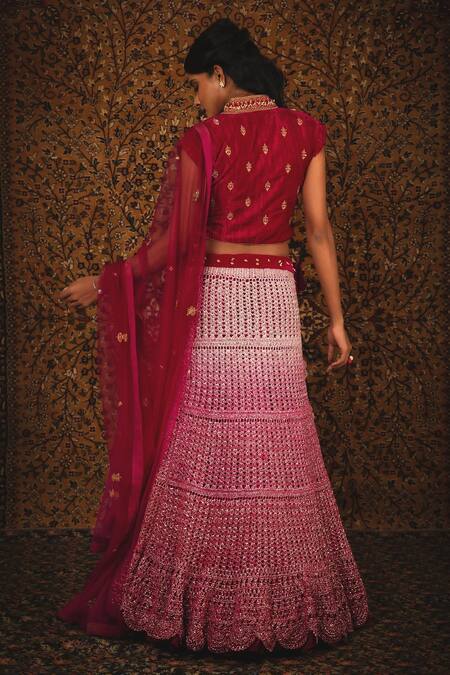 Ruby pink lehenga in hand knotted ombre mesh base. Paired with hand-crushed velvet blouse, net dupatta with embroidered buttis & pouch-belt.