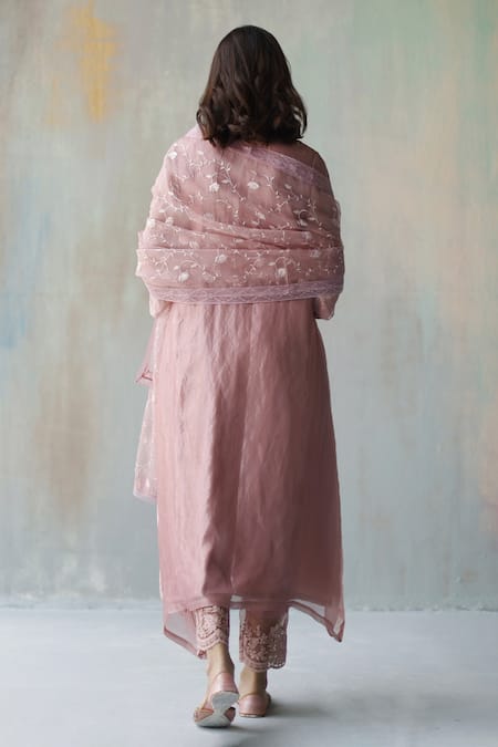 Plum kurta with embellished tissue sleeves & floral embroidered neckline. Paired with satin pant & organza dupatta.