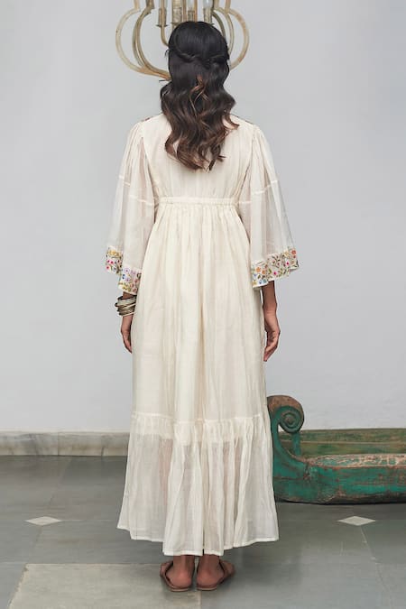 White tiered dress with floral embroidered yoke, flared sleeves, V-neckline and attached cotton lining.