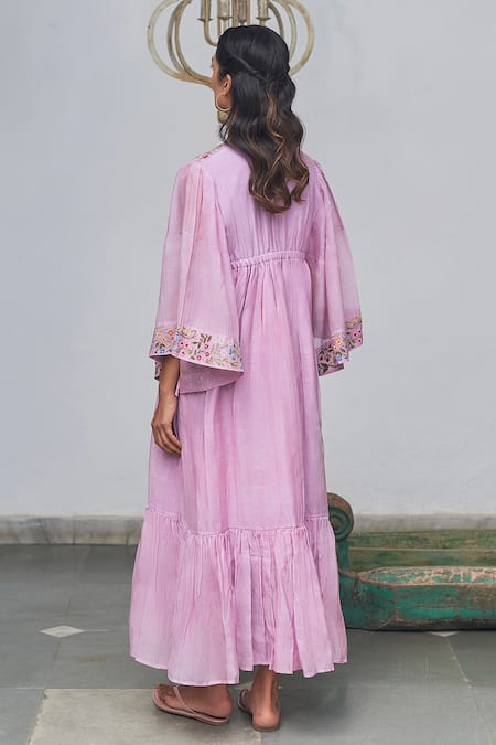 Pastel lilac tiered dress with floral embroidered yoke, flared sleeves, V-neckline and attached cotton lining.
