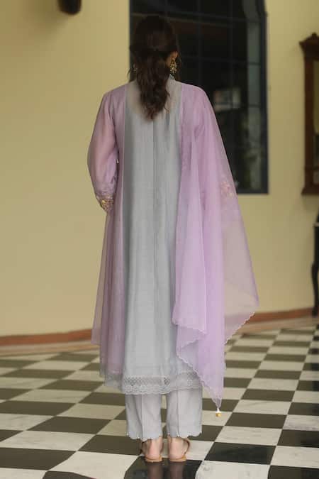Buy_Begum_Grey Dupatta Organza, Kurta Chanderi, Pant And Miren Embroidered A-line Set _at_Aza_Fashions