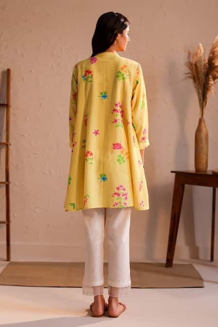 Yellow Linen Round Neck Tuscany Flower Bloom Print Tunic