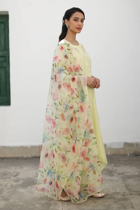 Lemon yellow chanderi A-line kurta featuring shikaara ambi & floral buttis embroidery with pearls. Paired with a printed dupatta and palazzo in jamdani fabric.