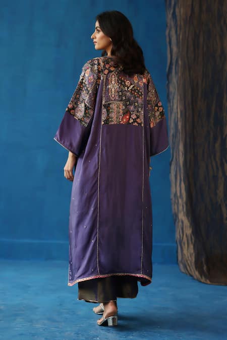 Purple phiran featuring intricate brocade work with hand-embroidered nakshi, dabka, sequin, resham, and pitta work. Paired with matching silk pant.
