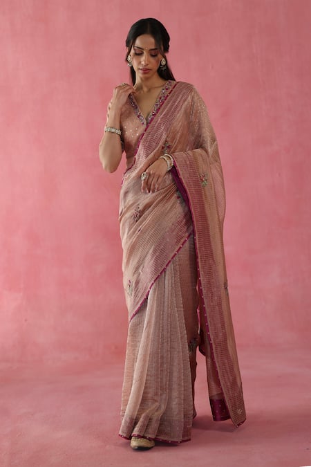 Hand embroidered nakshi and resham motifs, Gold weave throughout the saree, Polka dot blouse with matching embroidery