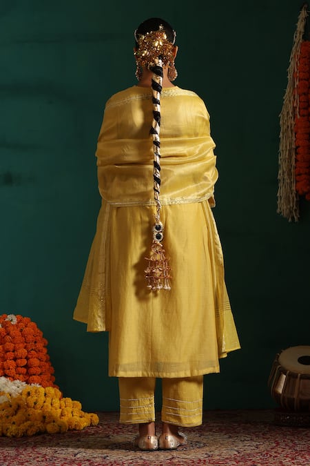 Yellow embroidered kurta featuring a V neck and three-fourth sleeves with hand tucked motis and sequins. Paired with a cotton satin pant and a zari striped dupatta, both adorned with similar embellishments.