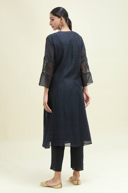 Black Chanderi, Cotton, Organza Sequins, Embroidery Ruched Kurta Pant Set