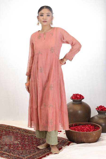 Peach Chanderi, Cotton Satin Beads, Sequins Thread Embroidered Anarkali Set