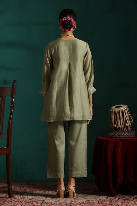 Green mul chanderi embroidered tunic featuring a blunt V neckline and tie-up detail in front. Paired with pure handblock printed cotton satin pant.