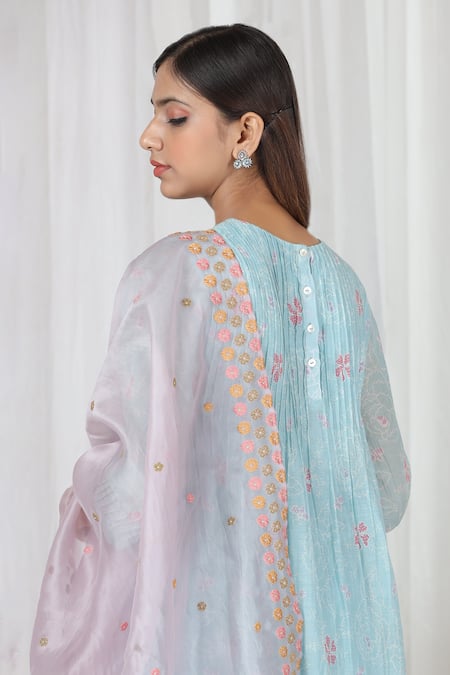 Floral embroidery detailing on kurta, Pleated texture on the kurta, Back button closure on kurta
