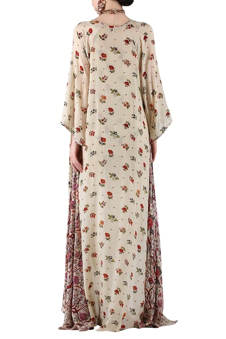 A beige top enhanced with floral print is teamed with a pair of matching pants. A long jacket with an open front, adds to the charm. Tailored with an easy fit, the set is sure to attract instant attention. Wear earrings and carry a clutch to complete the look.