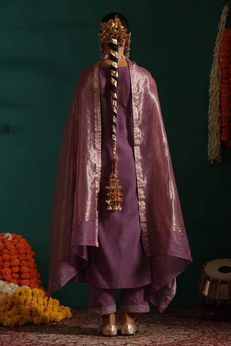 Purple mul chanderi kurta featuring floral embroidery on the neckline and sleeves, embellished with hand-tucked motis and sequins. Paired with embroidered border cotton satin pant and a chanderi dupatta with pure zari stripes and moti highlights.