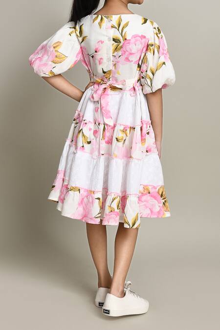 Puff sleeves with elastic cuffs, Tiered skirt design, Waist tie for adjustable fit