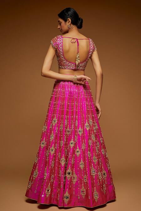 Hot pink lehenga in a pure silk base with attached can-can, embellished with lantern motifs in zari thread, mirror and pearl beads. Comes with padded cap sleeve blouse in sequin, zari, stone and crystal work and orange tulle dupatta with border embroidery.